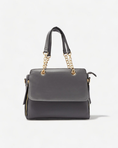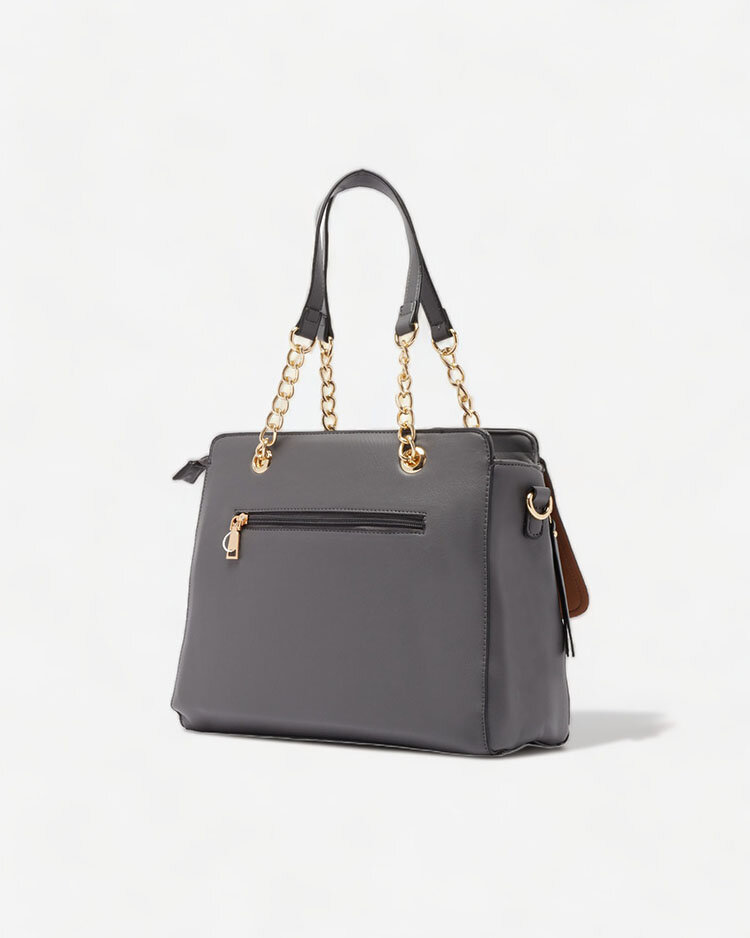 - Klasická dámska kabelka z ekokože s retiazkovými rúčkami a odnímateľným popruhom. Kabelka s látkovým interiérom uzatvárateľným na zips má 2 priehradky a 5 vreciek. Zipsy v prednej časti sú ozdobné.