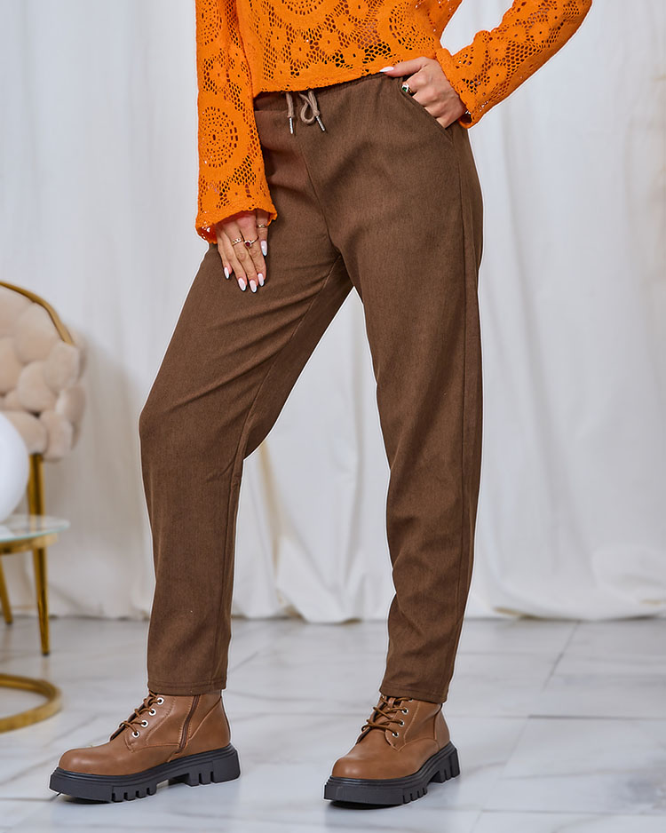 - Senzačné rovné nohavice pre ženy z manšestrovej látky. Model má elastický pás s nastaviteľným zaväzovaním. Okrem toho má na prednej strane dve vsadené vrecká. Ideálne na vytváranie štýlových outfitov!