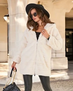 - Štýlový dámsky kabát z kožušinového materiálu. Model má voľný strih, má kapucňu, dlhé rukávy a zapínanie na zips. Na bokoch má našité dve hlboké vrecká. Skvelý na jeseň! UPOZORNENIE: Presnosť merania (+/-) 1 cm.
