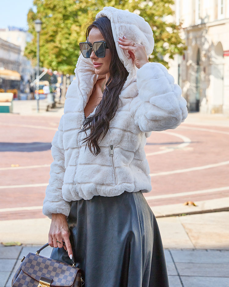 - Senzačná obojstranná dámska bunda z klzkej látky a príjemného, mäkkého materiálu a'la kožušina. Má mäkkú syntetickú výplň. Model s kapucňou, dvoma vreckami na zips a zapínaním na zips. Hit tejto sezóny!