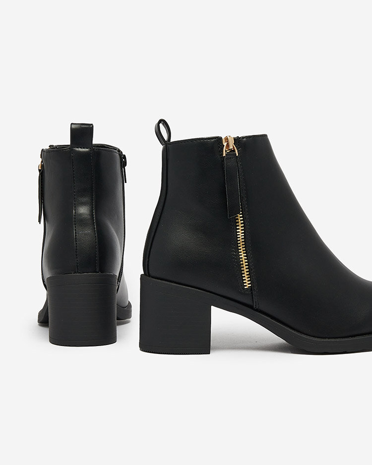 - Štýlové dámske nízke čižmy na podpätku. Zvršok je vyrobený z ekokože, vnútro je zateplené kožušinou. Obuv sa zapína na zips. Skvelá voľba na jeseň!