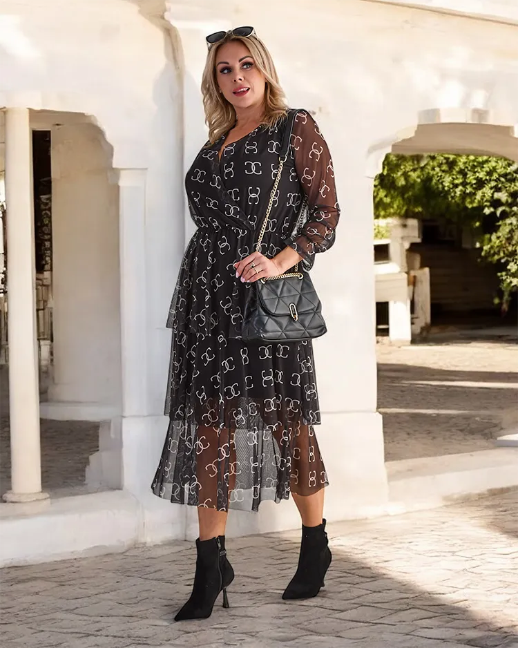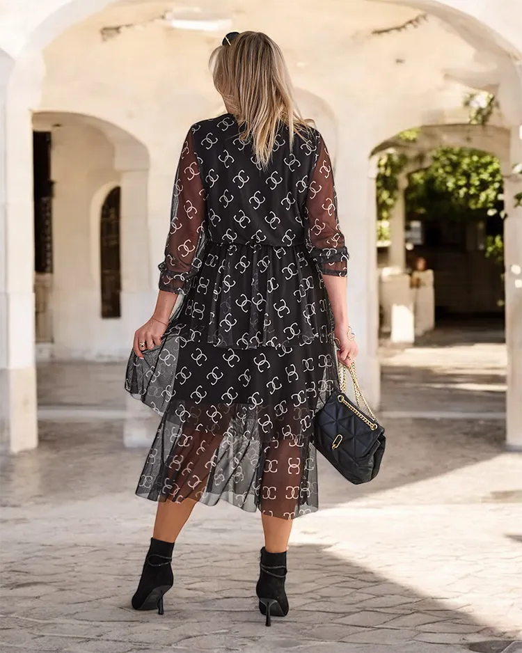 - Dámske midi šaty s potlačou z priesvitného materiálu a'la sieťovina s podšívkou. Model s dlhými rukávmi a srdiečkovým výstrihom s elastickým pásom. Ideálne na každodenné nosenie!