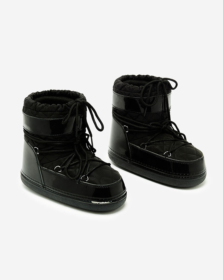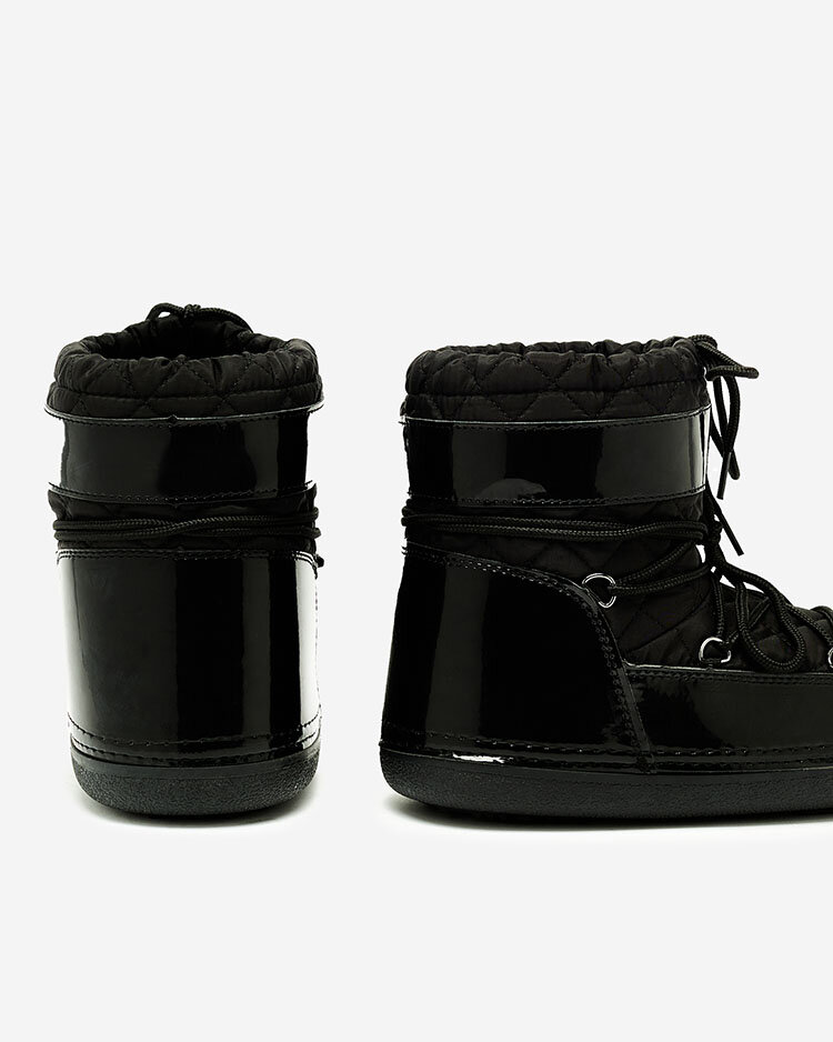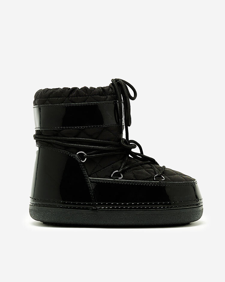 • Dámske snehové čižmy so zvrškom z kombinácie eko lakovanej kože a prešívaného textilného materiálu. Podšívka z vnútornej strany je textilná, obuv s nazúvaním a šnurovaním má lem.