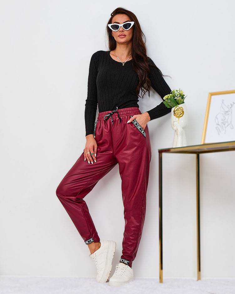 Royalfashion Voľné dámske nohavice z eko kože vo vínovej farbe