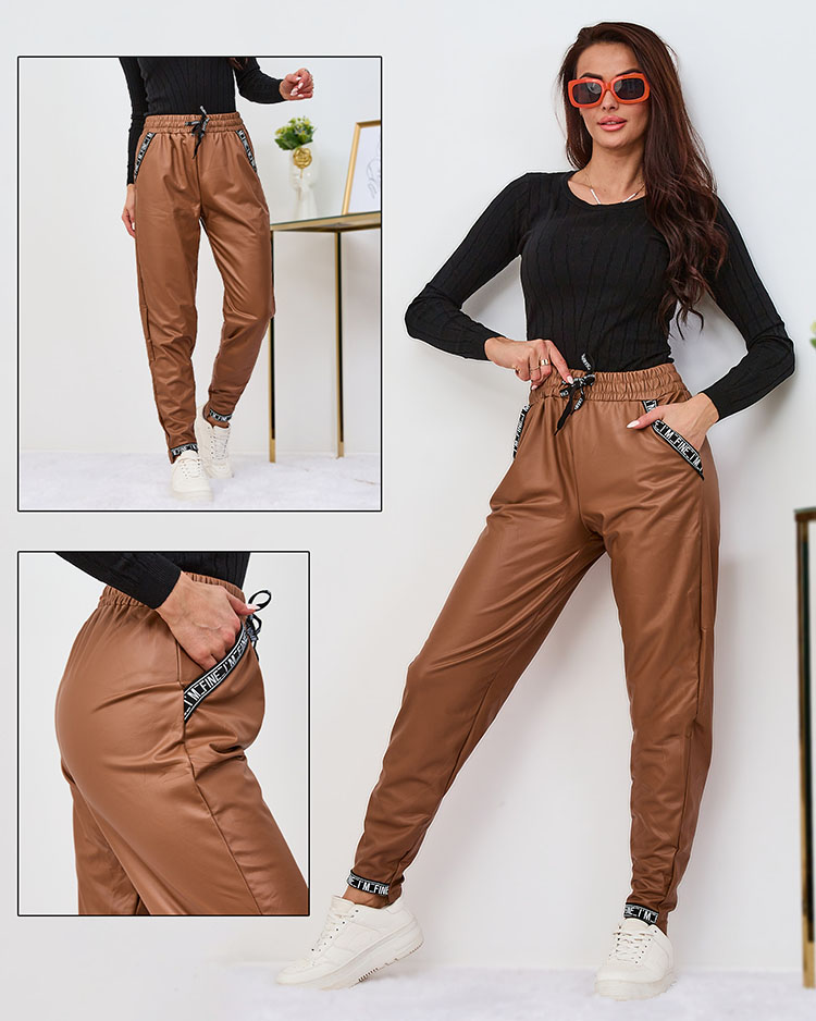 Royalfashion Voľné dámske nohavice z ekokože v ťavej farbe