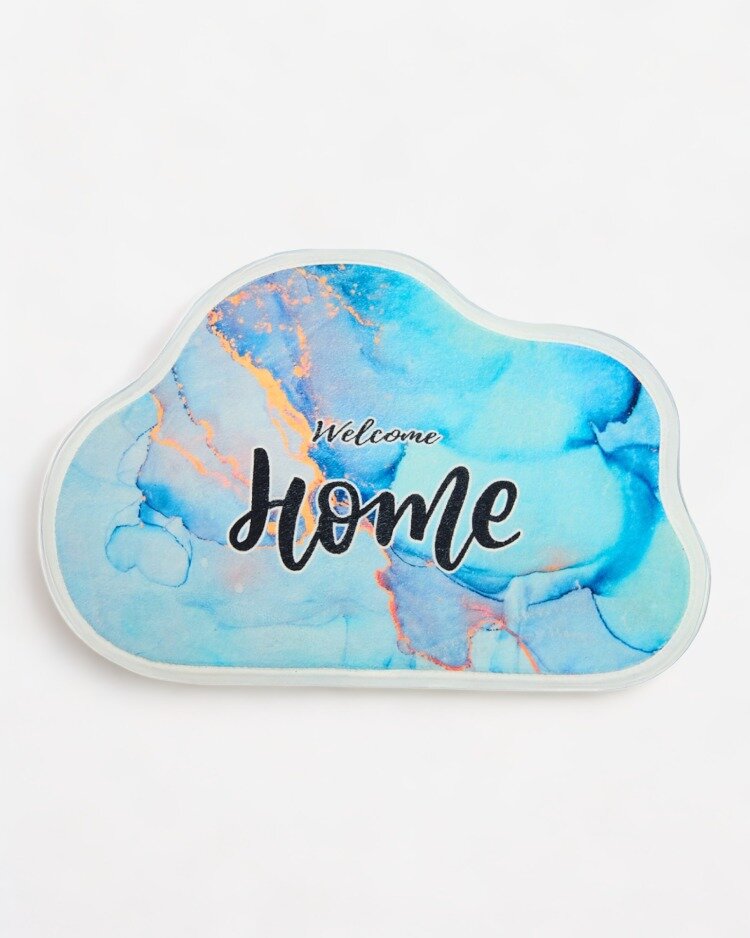 - Malá farebná rohožka s krátkym vlasom a nápisom "Vitajte doma". Je mäkký a jemný, vďaka čomu je mimoriadne príjemný na dotyk. Ďalšou výhodou koberčeka je jeho protišmyková spodná strana.