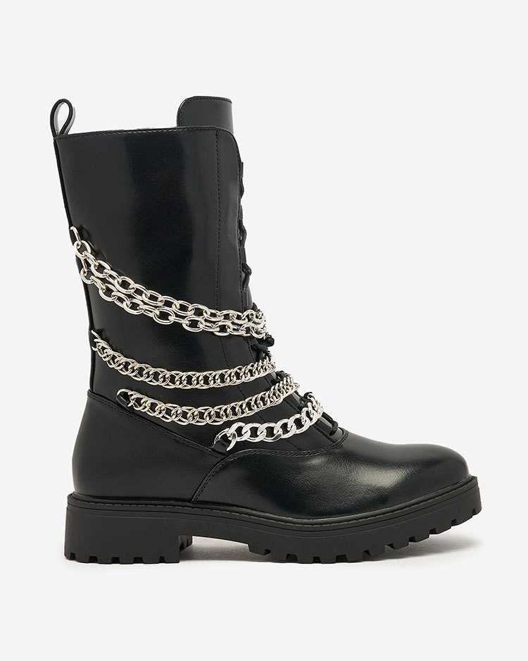 - Dámske čižmy bagger na pevnej podrážke. Zvršok je vyrobený z ekologickej kože, zdobený retiazkami a vnútri zateplený kožušinou. Model so šnurovaním a zapínaním na zips na boku. Skvelá voľba na chladnejšie dni!