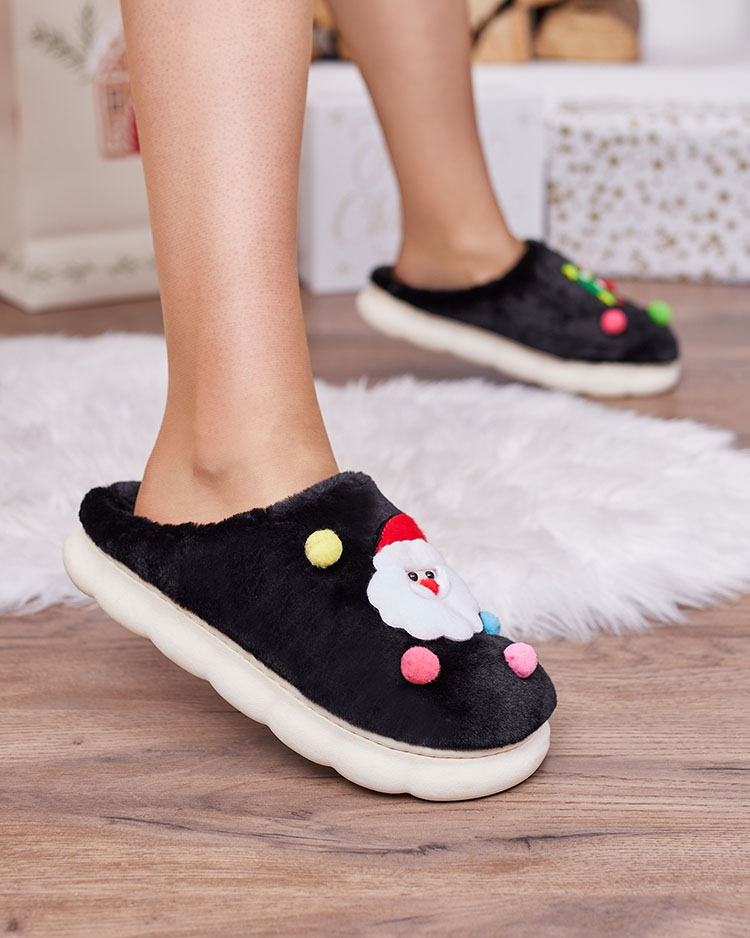 - Roztomilé dámske papuče na plochej podrážke, zdobené vianočnými nášivkami. Model je vyrobený z materiálu imitujúceho kožušinu. Skvelá voľba do domáceho outfitu!