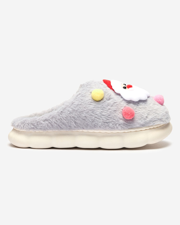 • Roztomilé dámske papuče na plochej podrážke, zdobené vianočnými nášivkami. Model je vyrobený z materiálu imitujúceho kožušinu. Skvelá voľba do domáceho outfitu!