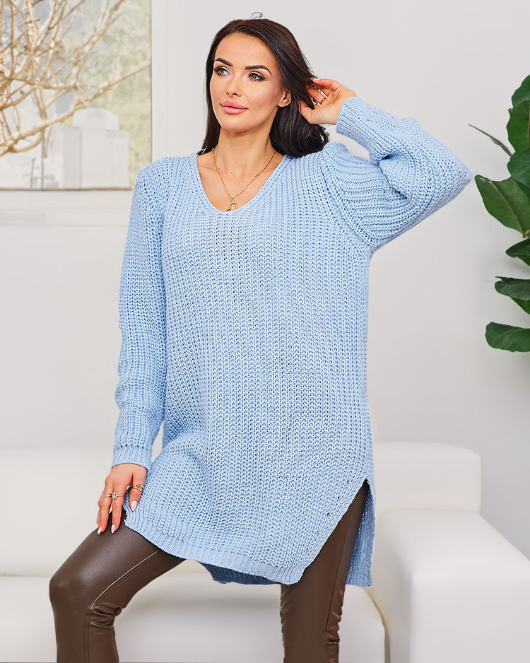 - Dlhší dámsky sveter z mäkkej pleteniny, sveter má srdiečkový výstrih a dlhé rukávy. Pletenec mu dodáva originálny štýl!