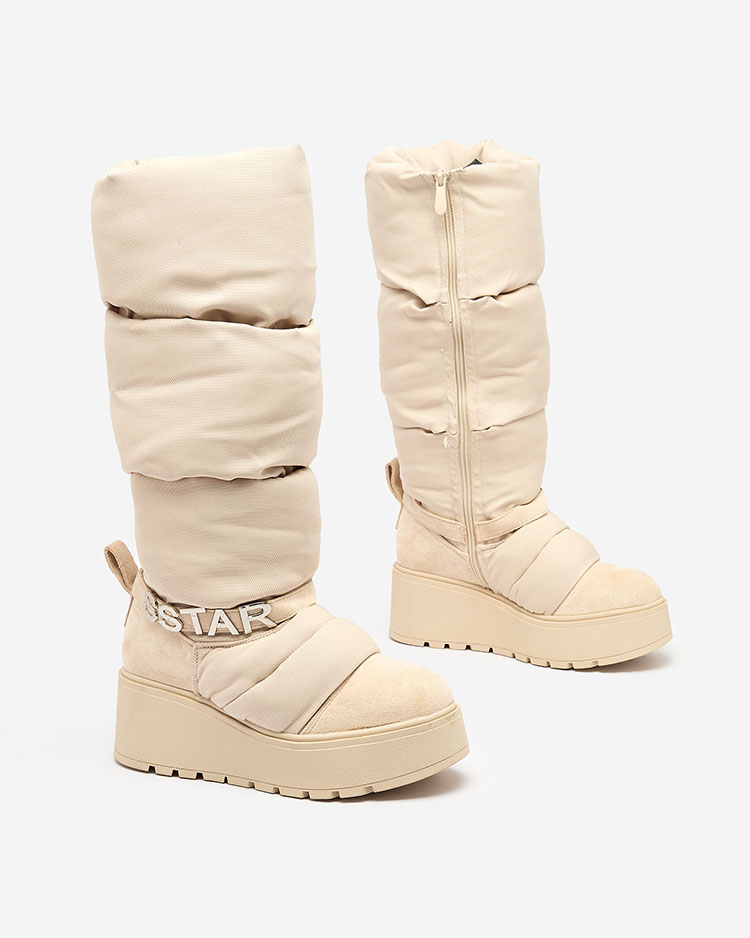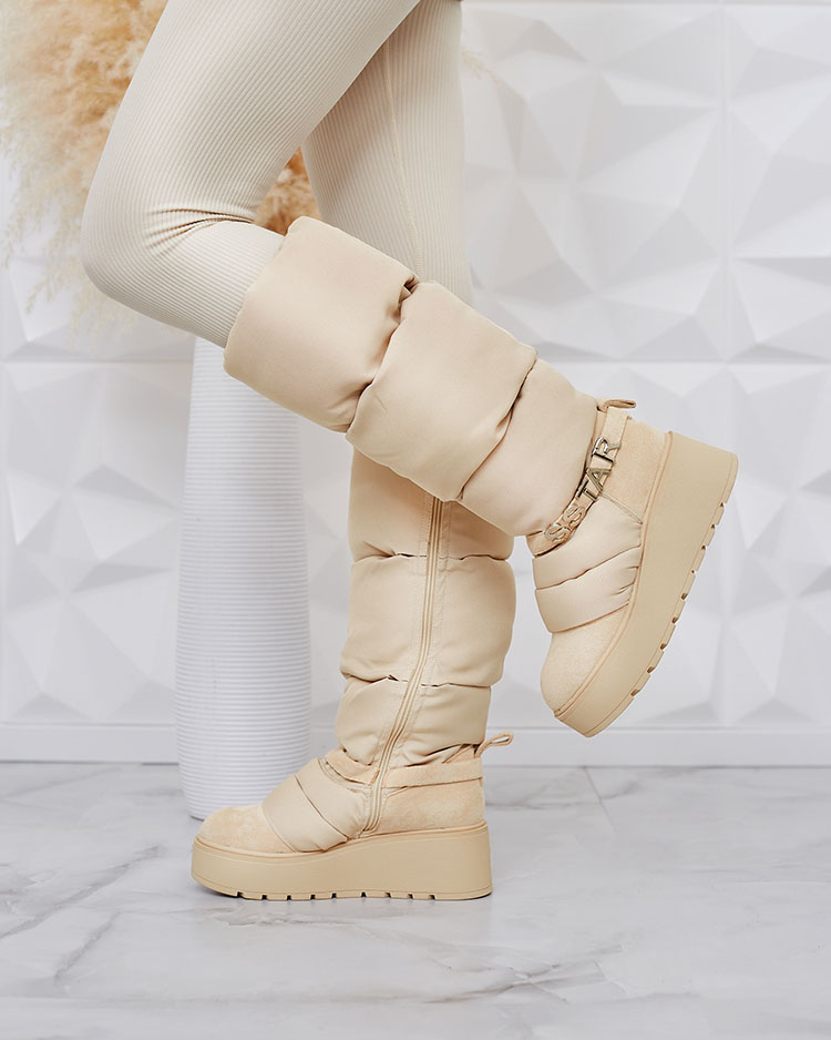 - Dámske čižmy na platforme. Vyrobené z ekologickej semišovej kože a zateplenej tkaniny okolo lýtka, vnútri kožušinová stielka. Model na zips. Ideálna voľba na zimnú štylizáciu!