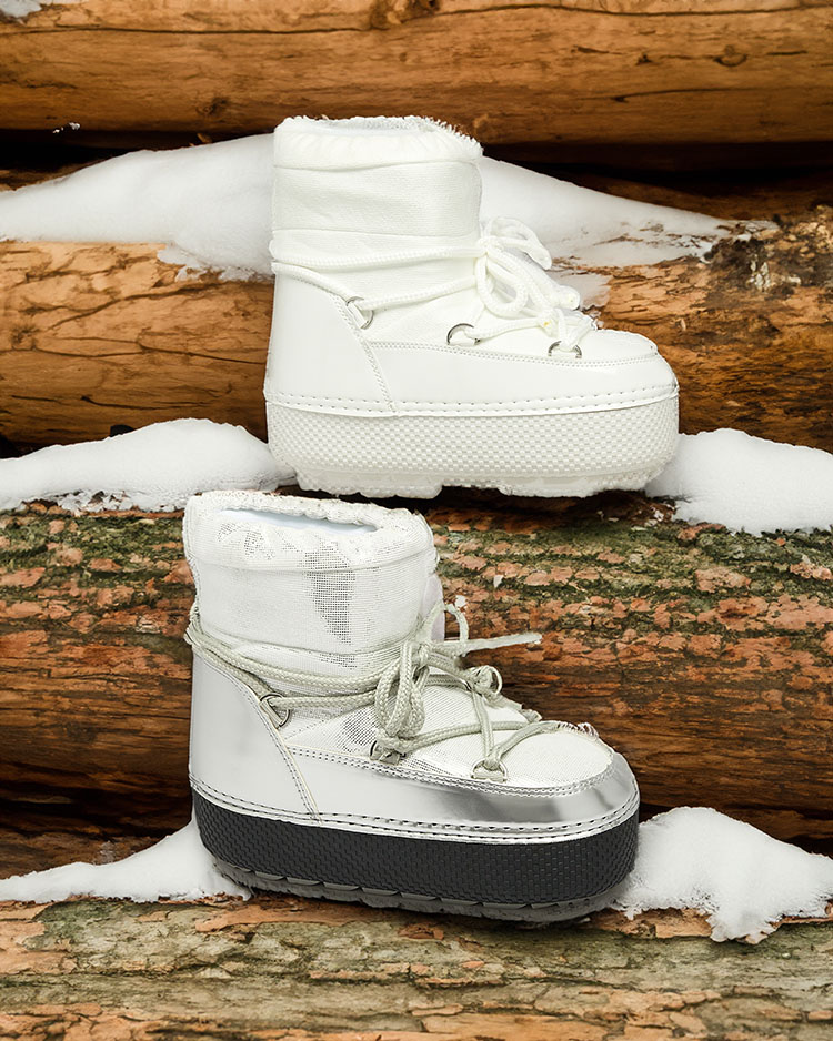 - Dámske snehulky so zvrškom z kombinácie eko lakovanej kože a textilného materiálu. Vnútorná strana podšitá látkou, obuv je nazúvacia a šnurovacia. Ideálne na zimu!