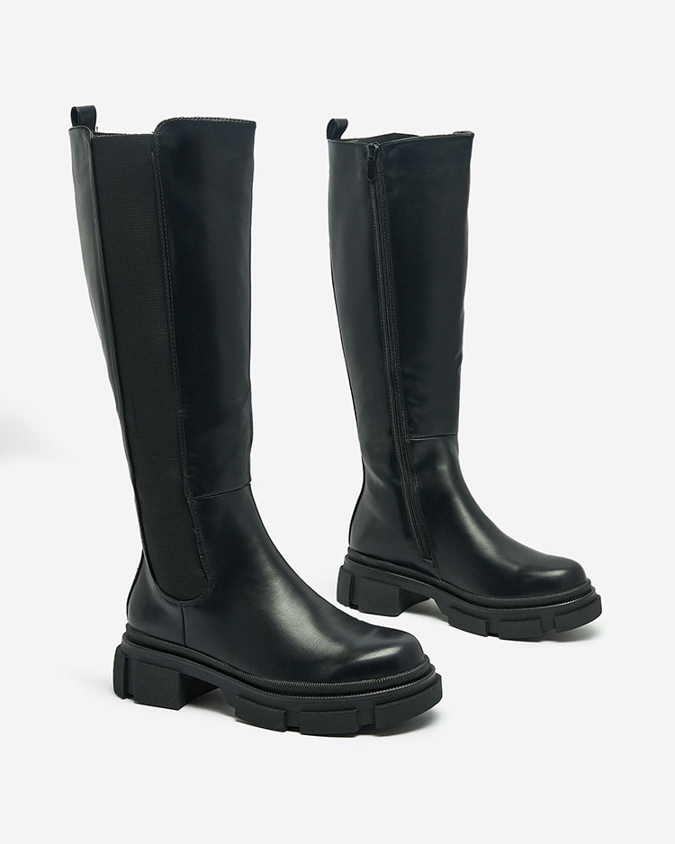 - Dámske čižmy do polovice lýtok, vyrobené z ekokože s textilnou stielkou. Model na plochom podpätku. Ozdobné látkové vsadky na priehlavku a päte. Obuv na zips s elastickou vsadkou na boku.