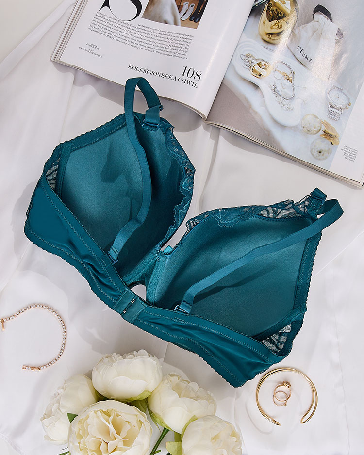 - Jedinečná dámska vystužená podprsenka s jemnými úpravami z jemnej čipky, ktoré jej dodávajú eleganciu. Výrobok sa vzadu zapína na dvojstupňové zapínanie na háčik a oko. Ramienka sú odnímateľné a s nastaviteľnou dĺžkou.