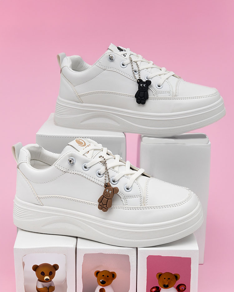 Objavte pohodlie a štýl s našimi bielymi teniskami na platforme. Navrhnuté pre dynamické ženy, ktoré ocenia kombináciu klasiky s módnymi akcentmi. Zlatý prívesok v tvare medvedíka dodáva originalitu, zatiaľ čo jemné prešívanie a kovové detaily podčiarkujú vysokú kvalitu obuvi. Podrážka na platforme nielenže dodáva niekoľko centimetrov výšky, ale poskytuje aj pohodlie pri chôdzi. Mäkká stielka zaručuje pohodlné nosenie počas celého dňa. Tieto tenisky sú ideálne na kombinovanie s džínsami, šatami alebo sukňami, takže sú dokonalým doplnkom ležérnych aj sofistikovanejších outfitov. Sú nielen praktické, ale aj štýlové, pričom sú povinnou výbavou v šatníku každej módnej ženy.