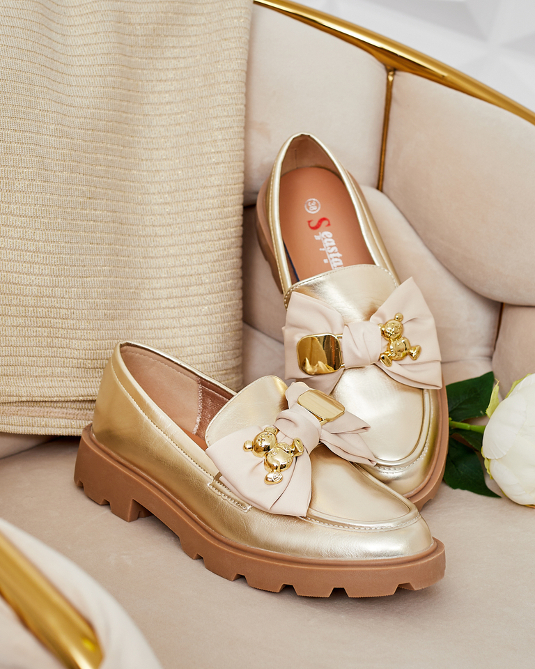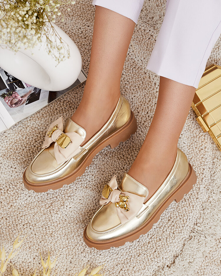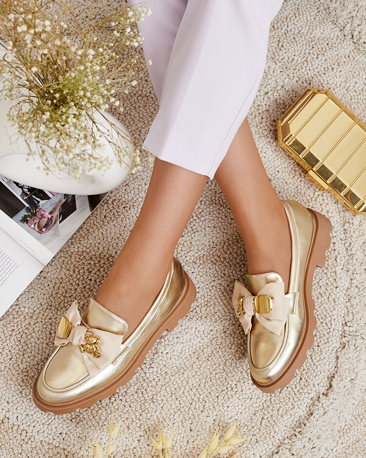 - Krásne dámske mokasíny na hrubšej podrážke. Model v ležérnom štýle je vyrobený z ekologickej lakovanej kože. Na priehlavku ozdoba v podobe mašle. Perfektný základ pre mnohé každodenné looky!