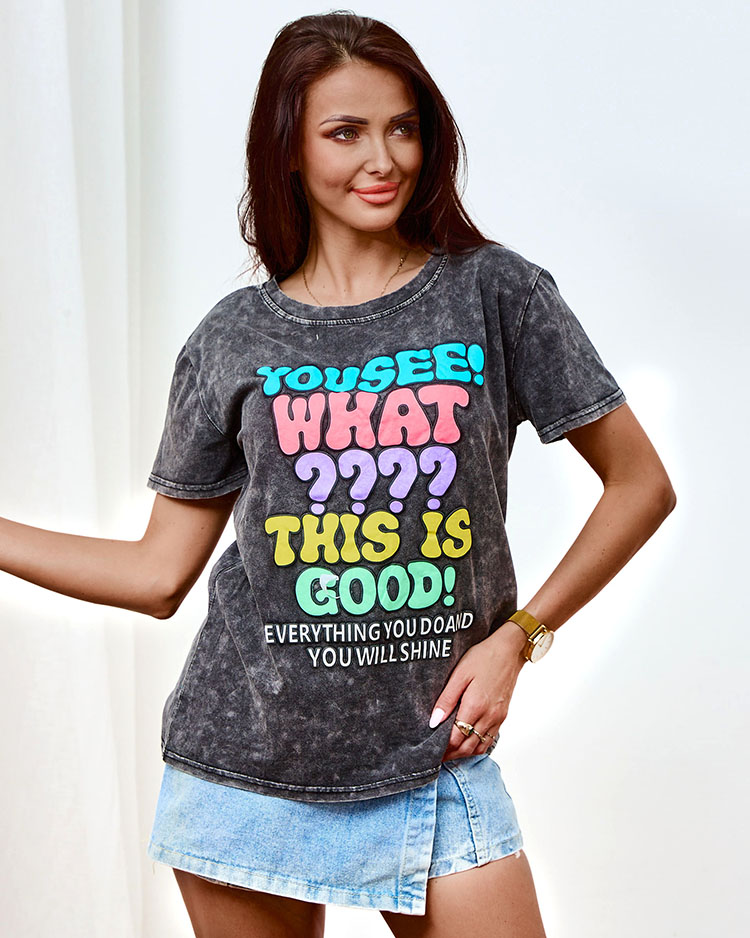 • Ležérne dámske tričko s potlačou a krátkym rukávom. Vyrobené z bavlnenej tkaniny. Ideálny základ pre mnohé každodenné looky! UPOZORNENIE: Presnosť merania (+/-) 1 cm. Rozmery merané na plocho.
