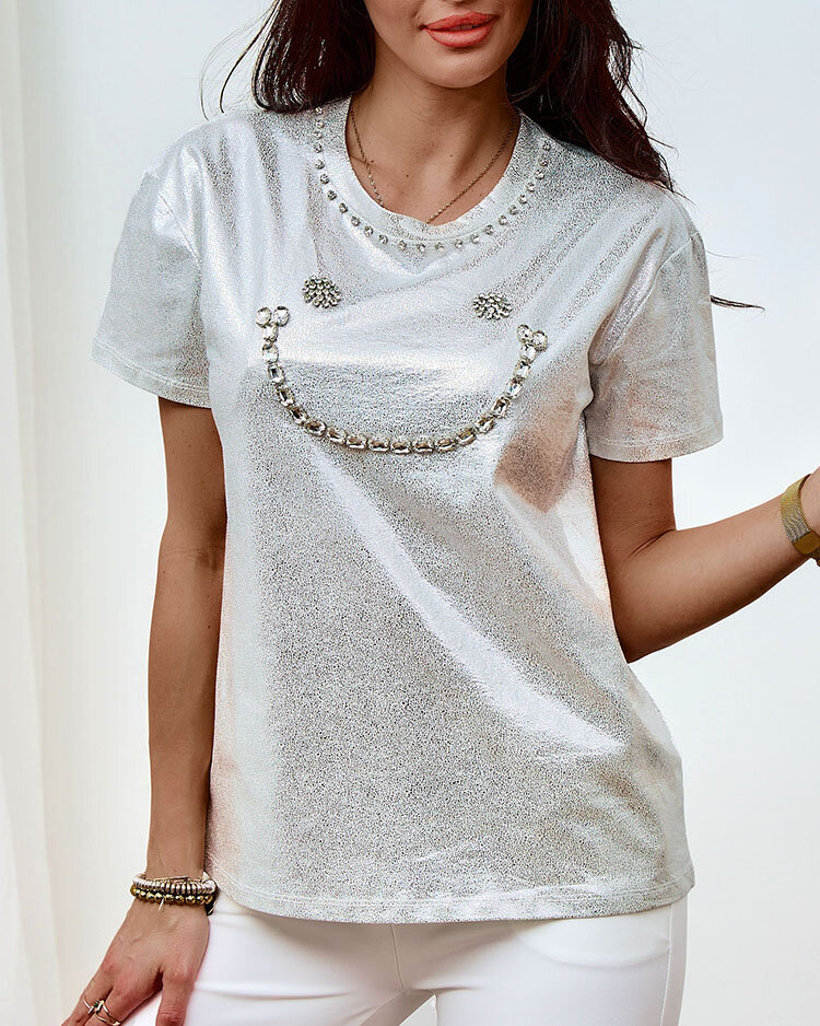 - Lesklé dámske tričko s krátkym rukávom. Vyrobené z bavlnenej tkaniny. Model zdobia zirkóny. Perfektný základ pre mnohé každodenné looky! UPOZORNENIE: Presnosť merania (+/-) 1 cm. Rozmery merané na plocho.