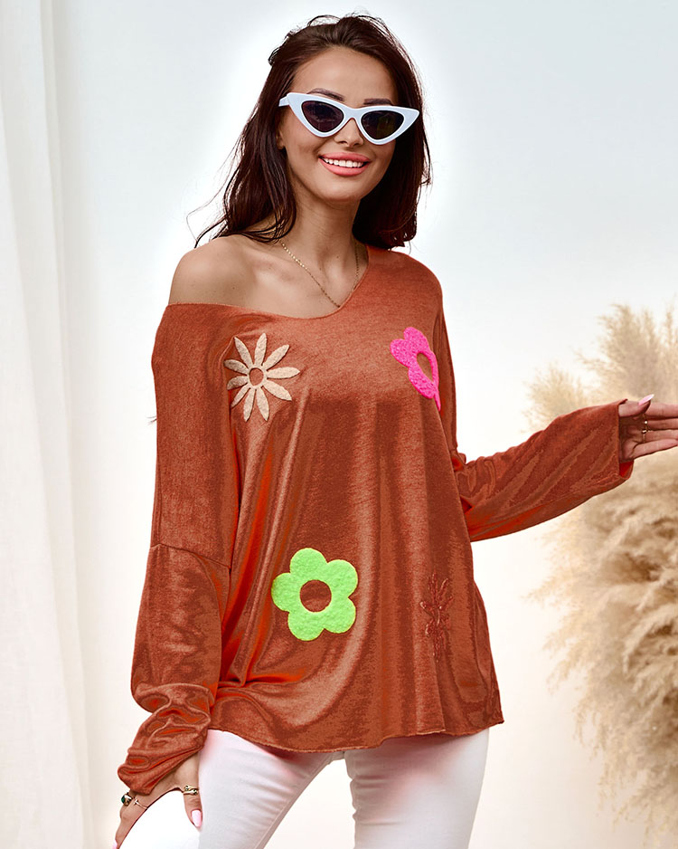 - Dámsky sveter so srdiečkovým výstrihom z príjemného materiálu. Model má dlhé rukávy a nášivky v tvare kvetov. Ideálny základ pre zimné outfity!