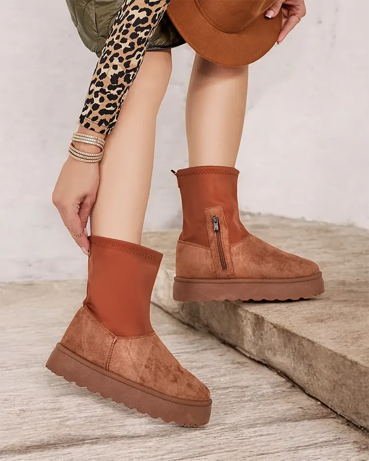 - Skvelé dámske zimné vysoké snehule na platforme. Zvršok je vyrobený z organickej semišovej kože v kombinácii s látkou, stielka zateplená kožušinou. Zapínanie na zips. Perfektný základ na zimu!