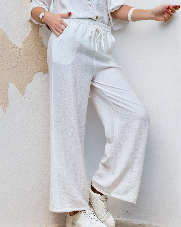 - Ležérny dámsky set z príjemného materiálu. Košeľa s dlhými ohrnutými rukávmi zapínaná na gombíky. Široké nohavice s elastickým pásom, 2 vreckami a viazaním.