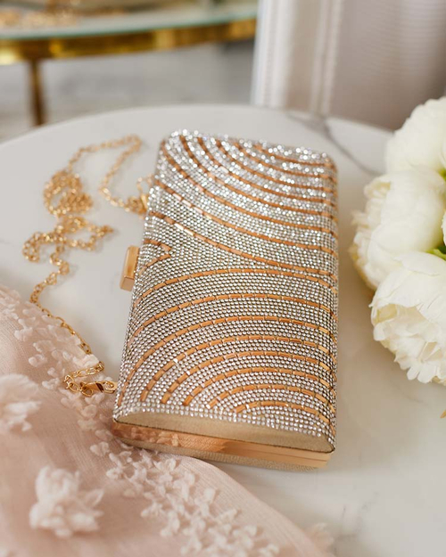- Elegantná malá dámska kabelka v tvare obálky zdobená zirkónmi a trblietavou niťou. Model so zapínaním na patentku, má 1 priehradku. Okrem toho odnímateľná retiazka na rameno. Ideálna na formálne vychádzky!