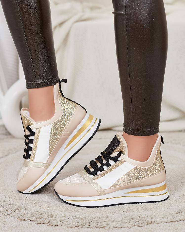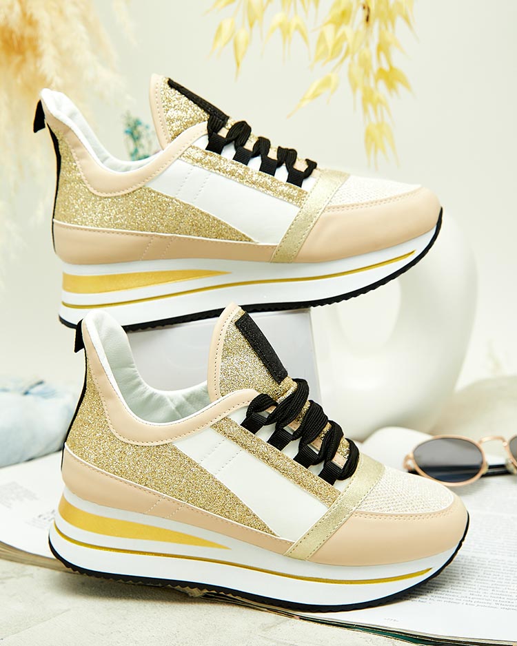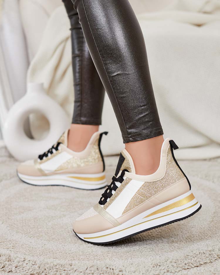 • Módne dámske športové tenisky na podpätku, vyrobené z kombinácie ekokože a látky s trblietkami. Vnútri stielka z ekokože. Budú skvelým doplnkom na každodennú štylizáciu.