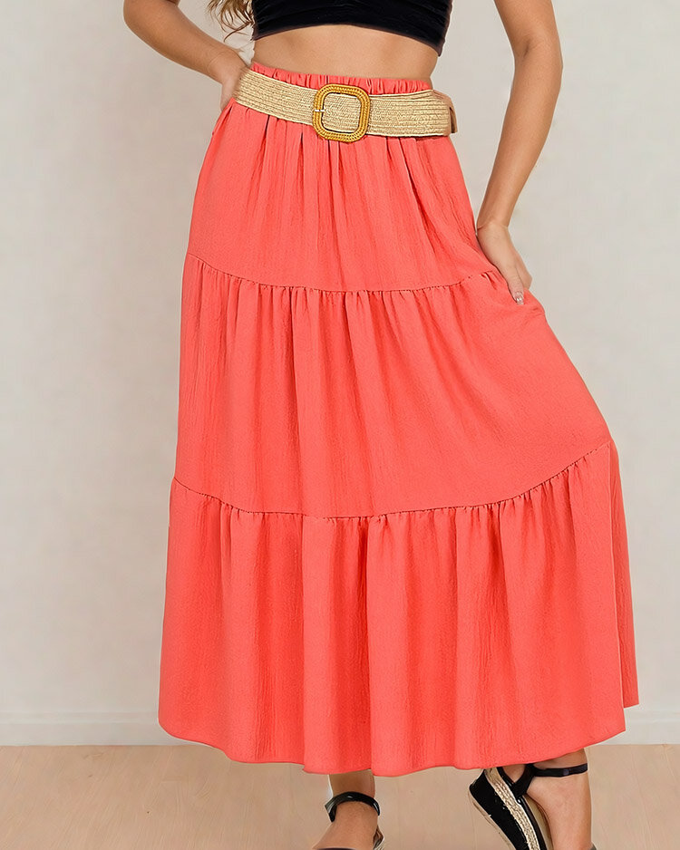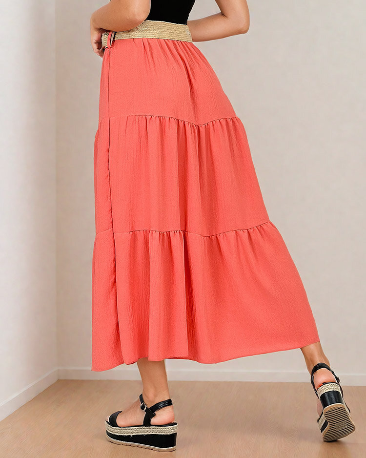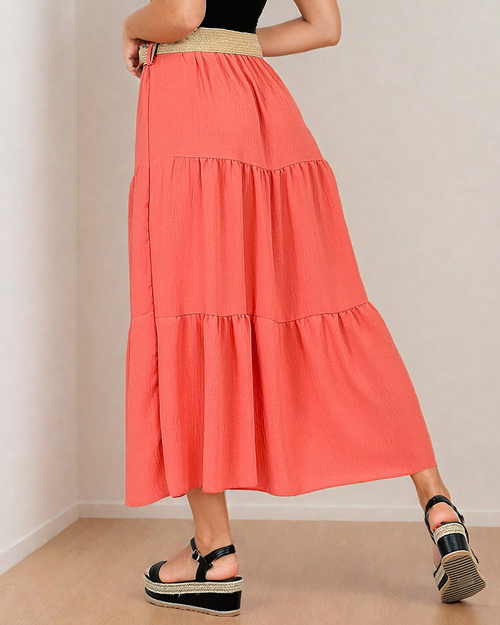 - Nadčasová dámska sukňa v midi dĺžke. Model má elastický pás, ktorý dokonale zvýrazňuje pás. Okrem toho je súčasťou balenia pletený opasok. Táto sukňa je skvelým doplnkom vášho každodenného vzhľadu!