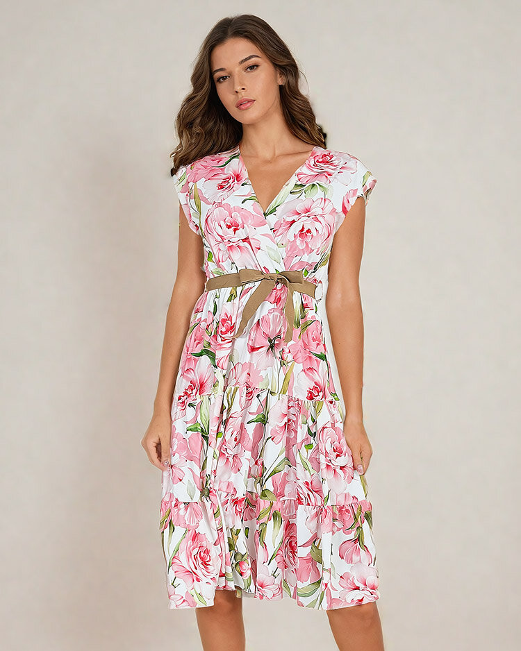 - Jedinečné dámske šaty z ľahkej tkaniny s kvetinovým vzorom. Vo výške pása majú opasok. Výrobok má midi dĺžku, krátke rukávy a je zakončený volánom. Cíťte leto v tomto modeli!