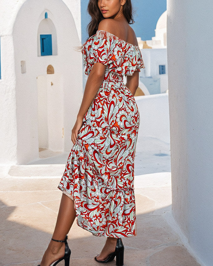 • Vzorovaná letná dámska súprava z príjemnej, ľahkej tkaniny. Krátky top v španielskom štýle má okrúhly výstrih a elastický pás. Dlhá sukňa má elastický pás a ozdobné volány. POZNÁMKA: Presnosť merania (+/-) 1 cm.