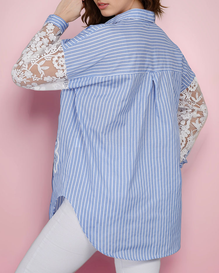 - Dámska košeľa s dlhými čipkovanými rukávmi zdobená pruhovaným vzorom. Okrem toho lesklá nášivka. Model sa zapína na gombíky. Musí byť v šatníku každej ženy!