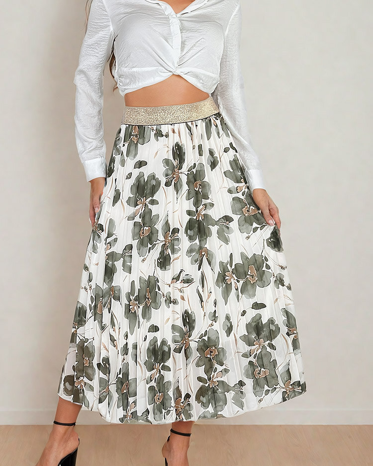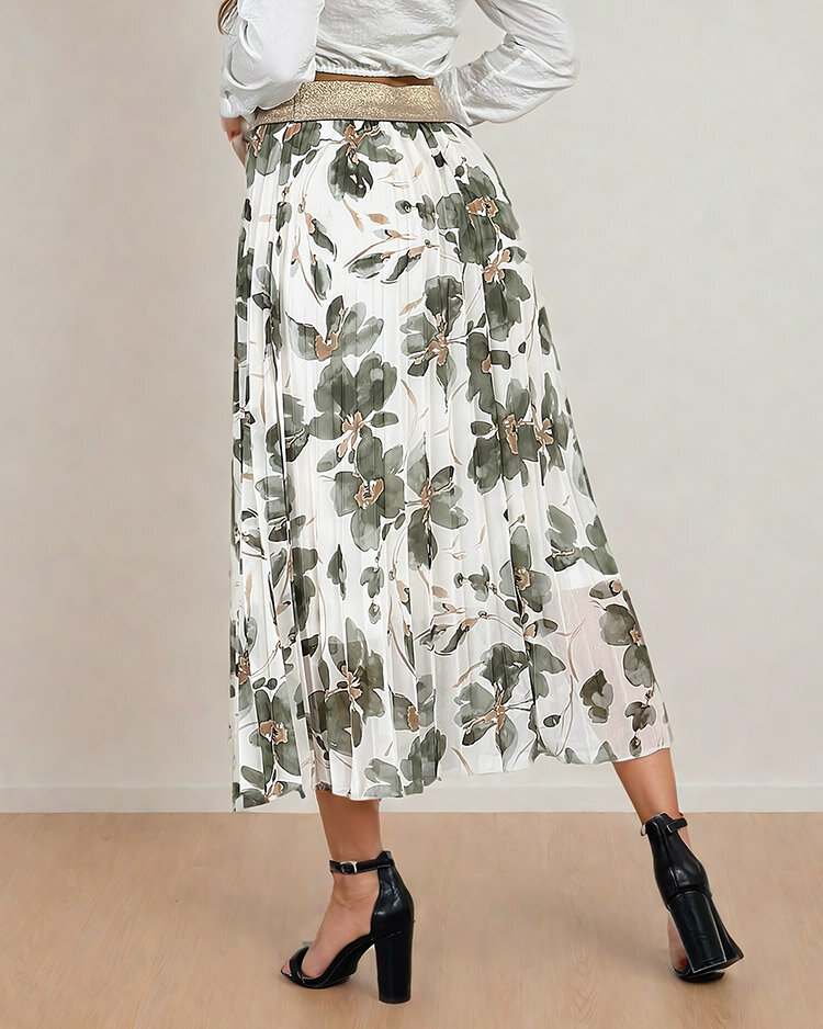 - Dámska plisovaná sukňa v midi dĺžke. Model má elastický pás, ktorý dokonale zvýrazňuje pás. Navyše je zdobená kvetinovým vzorom. Táto sukňa je skvelým doplnkom vášho každodenného vzhľadu!