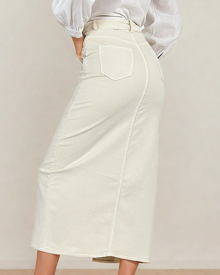 • Štýlová džínsová dámska midi sukňa, model má 4 vrecká a zapínanie na gombík a zips, vpredu rozparok. POZNÁMKA: Presnosť merania (+/-) 1 cm.