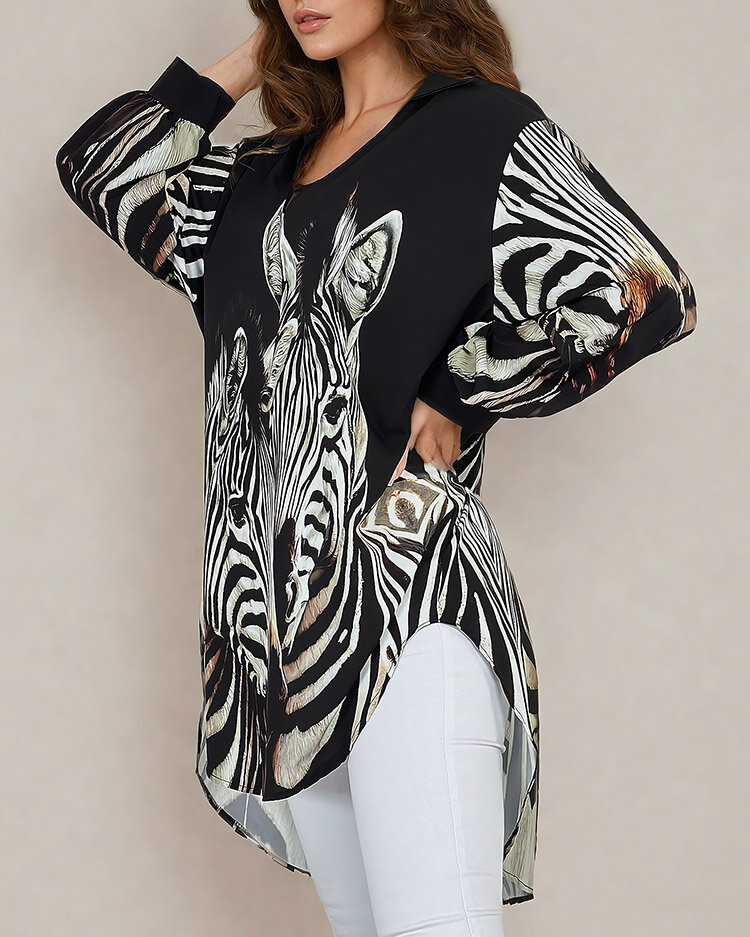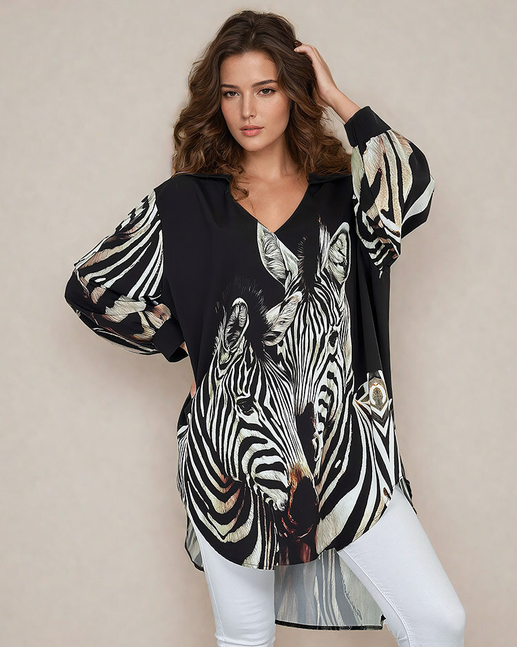 - Dámska vzorovaná tunika s výstrihom do V a 3/4 rukávmi, vyrobená z príjemného materiálu. Model s asymetrickou spodnou časťou. Ideálny základ na každý deň!