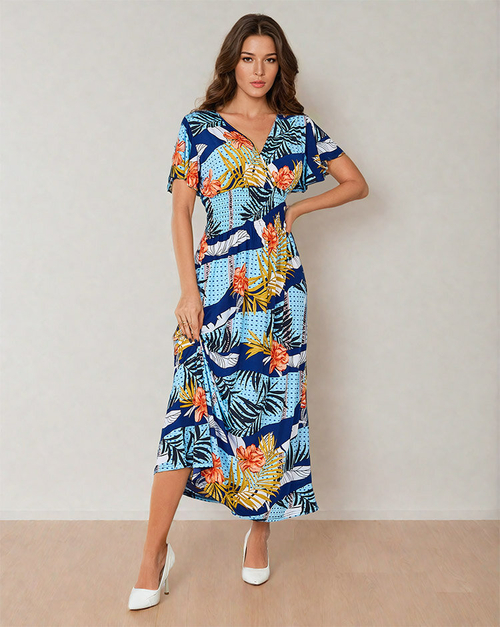 - Jedinečné dámske šaty z ľahkej tkaniny. Výrobok v midi dĺžke, s krátkymi rukávmi a srdiečkovým výstrihom. Model zdobí potlač. Cíťte leto v tomto modeli!