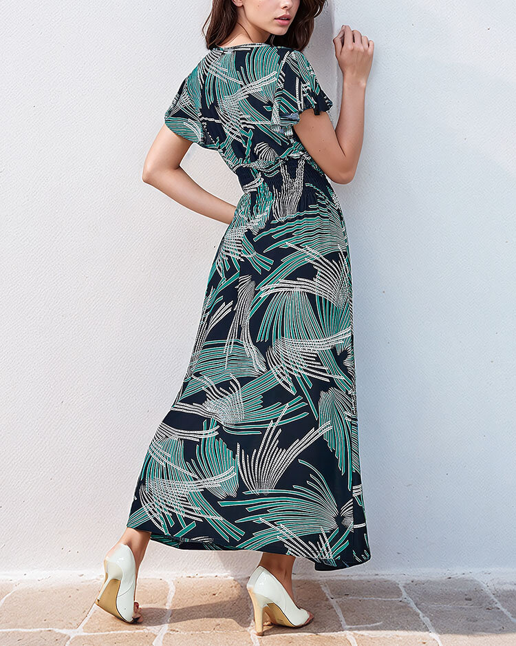 - Jedinečné dámske šaty z ľahkej tkaniny. Výrobok v midi dĺžke s krátkymi rukávmi, obálkovým výstrihom a elastickým pásom. Model zdobí potlač. Cíťte leto v tomto modeli!