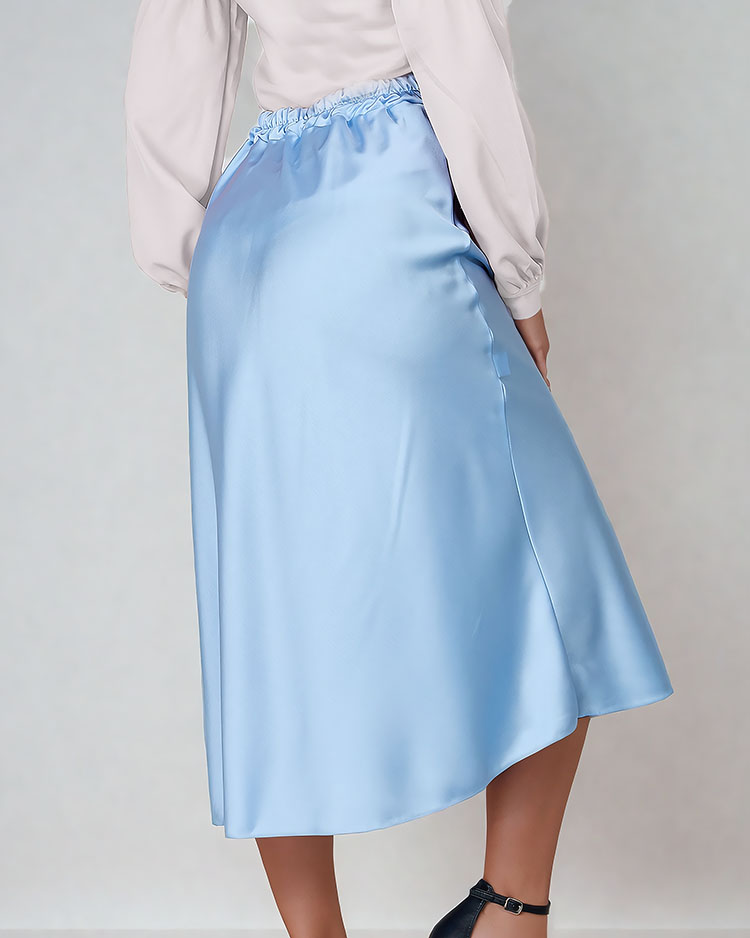 - Nadčasová dámska sukňa v midi dĺžke. Model má elastický pás, ktorý dokonale zvýrazňuje pás. Je vyrobená z príjemného materiálu a'la satén. Táto sukňa je skvelým doplnkom vášho každodenného vzhľadu!