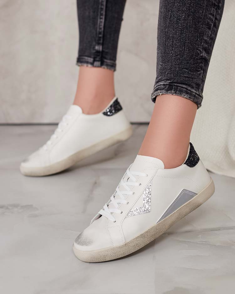 - Dámske tenisky z ekokože na plochej podrážke - dokonalá kombinácia štýlu a pohodlia. Model so šnurovaním, má stielku z ekokože. Zvršok zdobia ozdobné brokátové vsadky. Perfektné na každodenné nosenie!