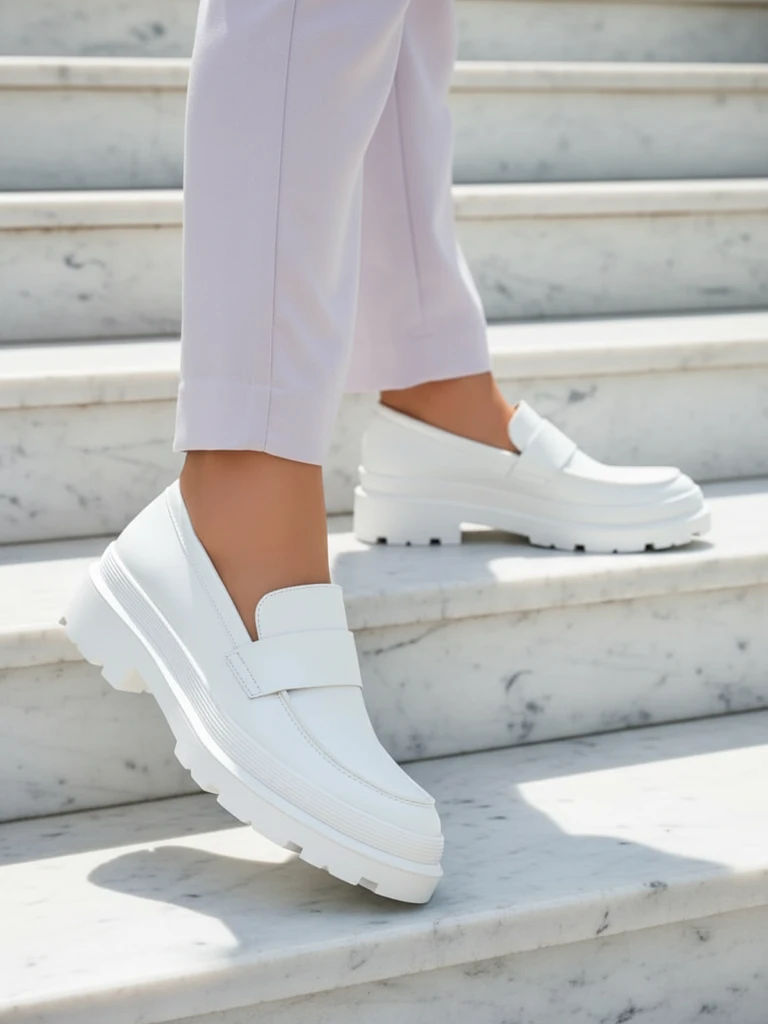Mokasini na platformi so eden najbolj vročih trendov zadnjih sezon. Združujejo klasično eleganco z modernim, nekoliko androgenim stilom. Bela obutev je hit pomladi in poletja, saj dodaja svežino in lahkotnost vsaki stilski kombinaciji. Model Aura se odlično vklaplja v modni tok 'udobje na prvem mestu', kjer udobje gre z roko v roki z prefinjenim dizajnom. To je idealna izbira za ženske, ki želijo slediti trendom, ne da bi se odpovedale praktičnosti.