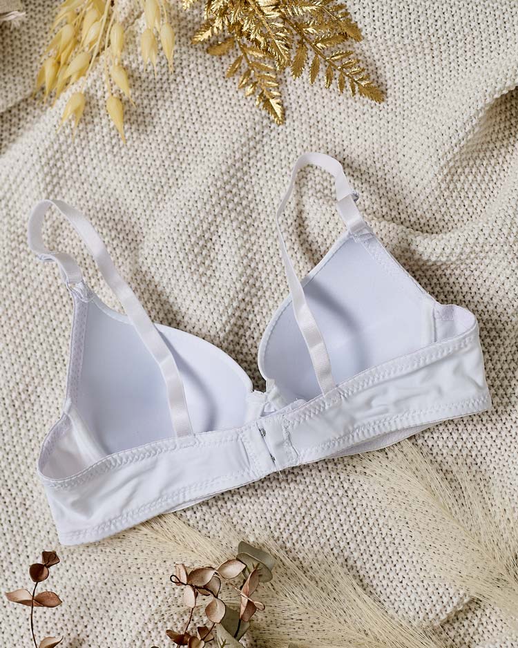 - Jedinečná dámska hladká podprsenka, výrobok sa vzadu zapína na dvojstupňové zapínanie na háčik a oko. Ramienka majú nastaviteľnú dĺžku. Medzi košíčkami je decentná mašlička. POZNÁMKA: Presnosť merania (+/-) 1 cm.