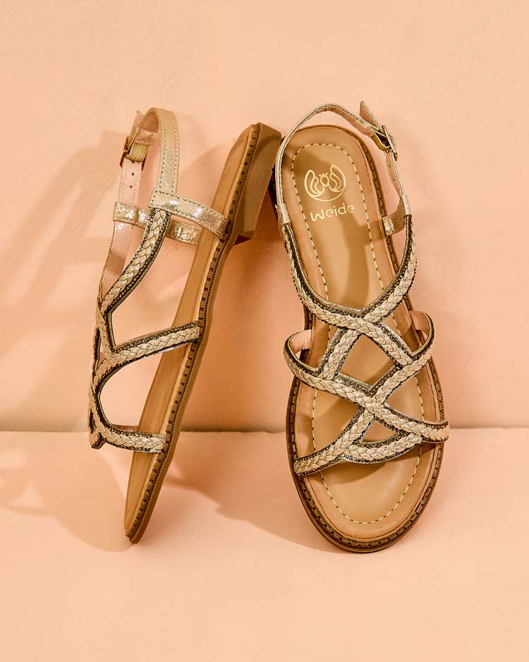 • Dámske sandále na nízkej podrážke - ideálny nápad na horúce letné dni. Model kompletne vyrobený z ekokože. Zvršok zdobený ozdobnými zirkónmi.