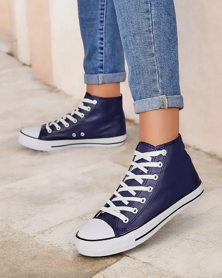 - Dámske vysoké športové tenisky z ekokože a textilnou stielkou. Model na pohodlnej podrážke. Zvršok je šnurovací. Skvelé na vytváranie ležérnych outfitov!