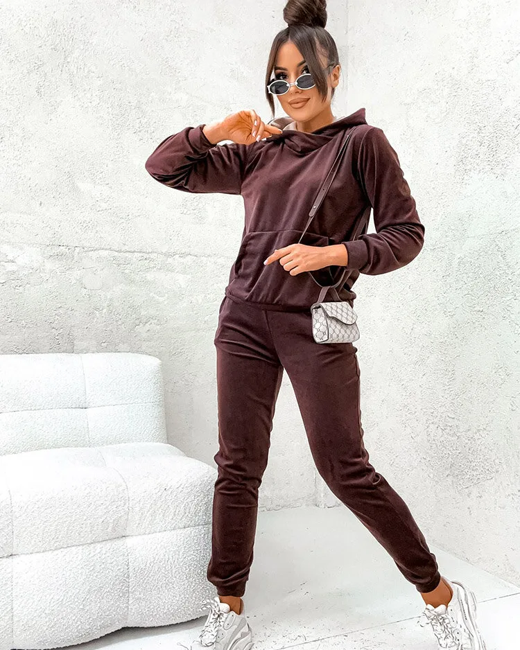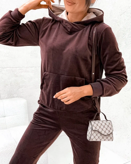 - Dámsky a'la velúrový set z príjemného materiálu. Vložená mikina s kapucňou a dlhými rukávmi. Dlhé nohavice s elastickým pásom, 2 vrecká. Pocíťte štýl v tejto nádhernej súprave!