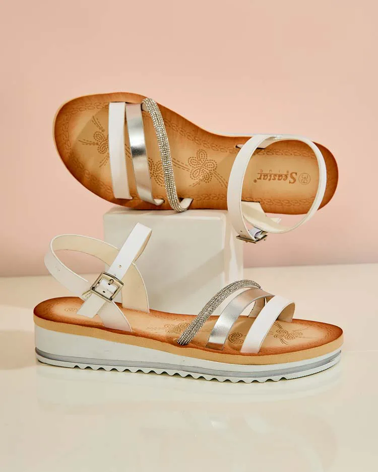 - Dámske sandále na plochej podrážke - ideálny nápad na horúce letné dni. Model kompletne vyrobený z ekokože. Vpredu zdobený elegantným remienkom so zirkónmi a okolo členka zapínanie na pracku.
