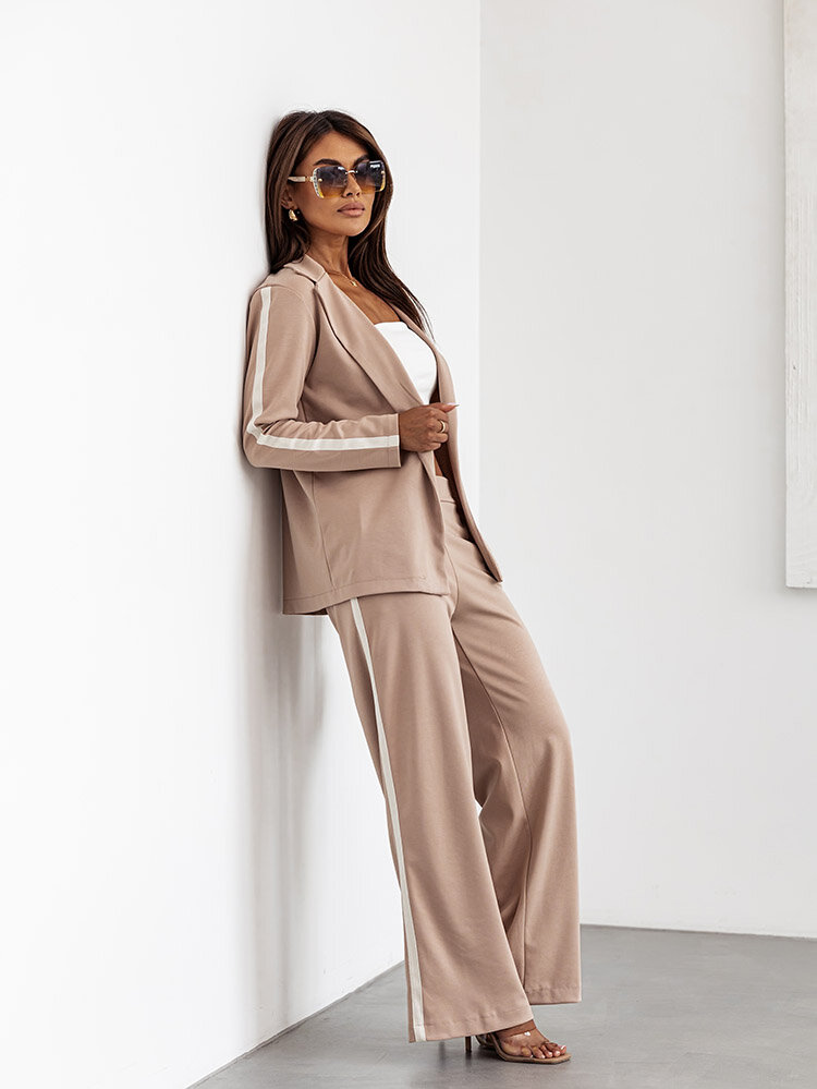 • Originálna dámska súprava z príjemného textilného materiálu. Mikina s dlhými rukávmi bez kapucne, zapínanie na zips. Široké nohavice s elastickým pásom a 2 vreckami. Celý odev je zdobený lamelami. Elegancia a štýl v jednom!