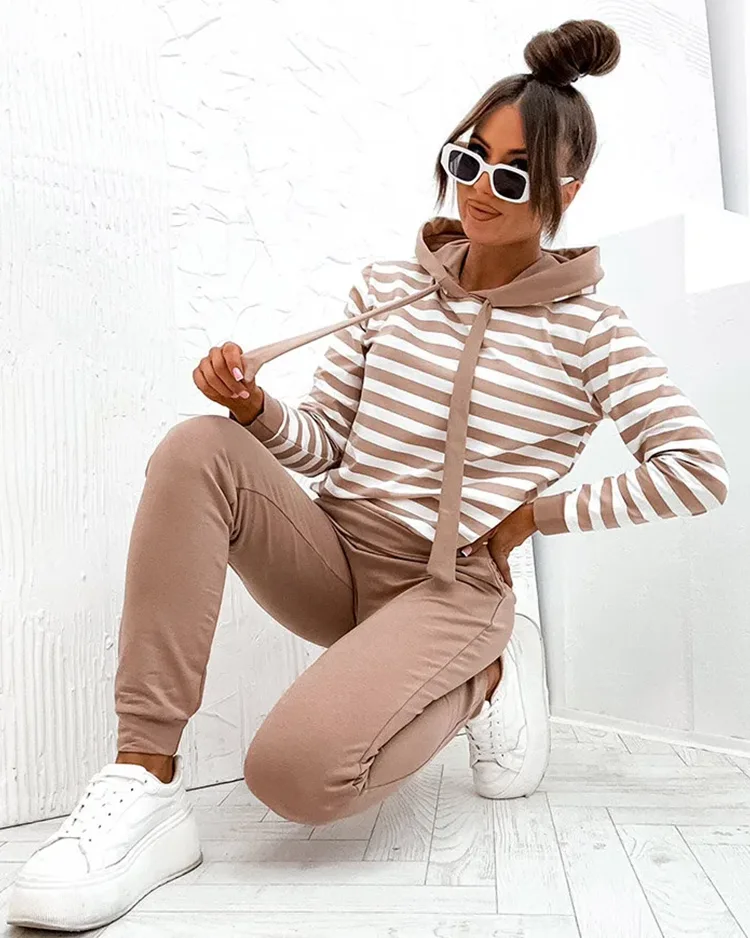 - Dámsky komplet z príjemného textilného materiálu v pruhovanom vzore. Nazúvacia mikina s dlhými rukávmi a kapucňou. Tepláky s elastickým pásom a 2 vreckami. Ideálna voľba na každodenné nosenie!