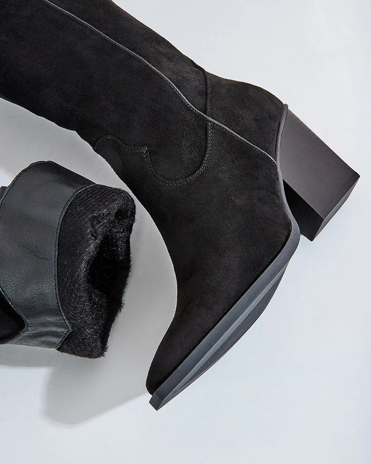 • Čižmy a'la kovbojské čižmy na nízkom podpätku, vyrobené z organickej semišovej kože s ozdobným razením. Látková stielka, čižmy so zipsom do polovice lýtok. Obuv má jemný kožúšok. Hodia sa k mnohým dámskym štýlom!