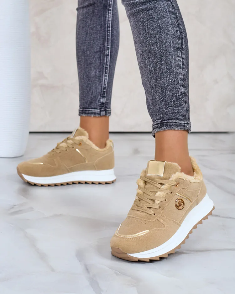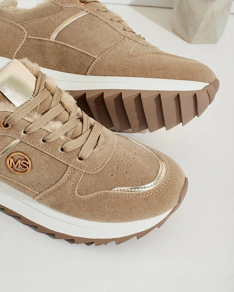 • Športové tenisky pre ženy na hrubšej podrážke. Šnurovací zvršok, vyrobený z ekologického nubuku. Vnútorná časť plne zateplená kožušinou. Ideálne na chladnejšie dni!