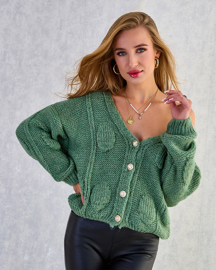 - Dámsky sveter so srdiečkovým výstrihom z príjemnej pleteniny. Model má ozdobné odnímateľné gombíky. Ideálny základ na chladnejšie dni!