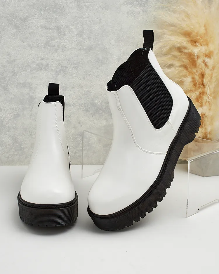 - Čižmy na hrubšej podrážke - štýl a pohodlie v jednom. Na bokoch má elastické vsadky. Celé vyrobené z ekokože a textilná stielka vo vnútri. Tento model vám dodá sebavedomie!